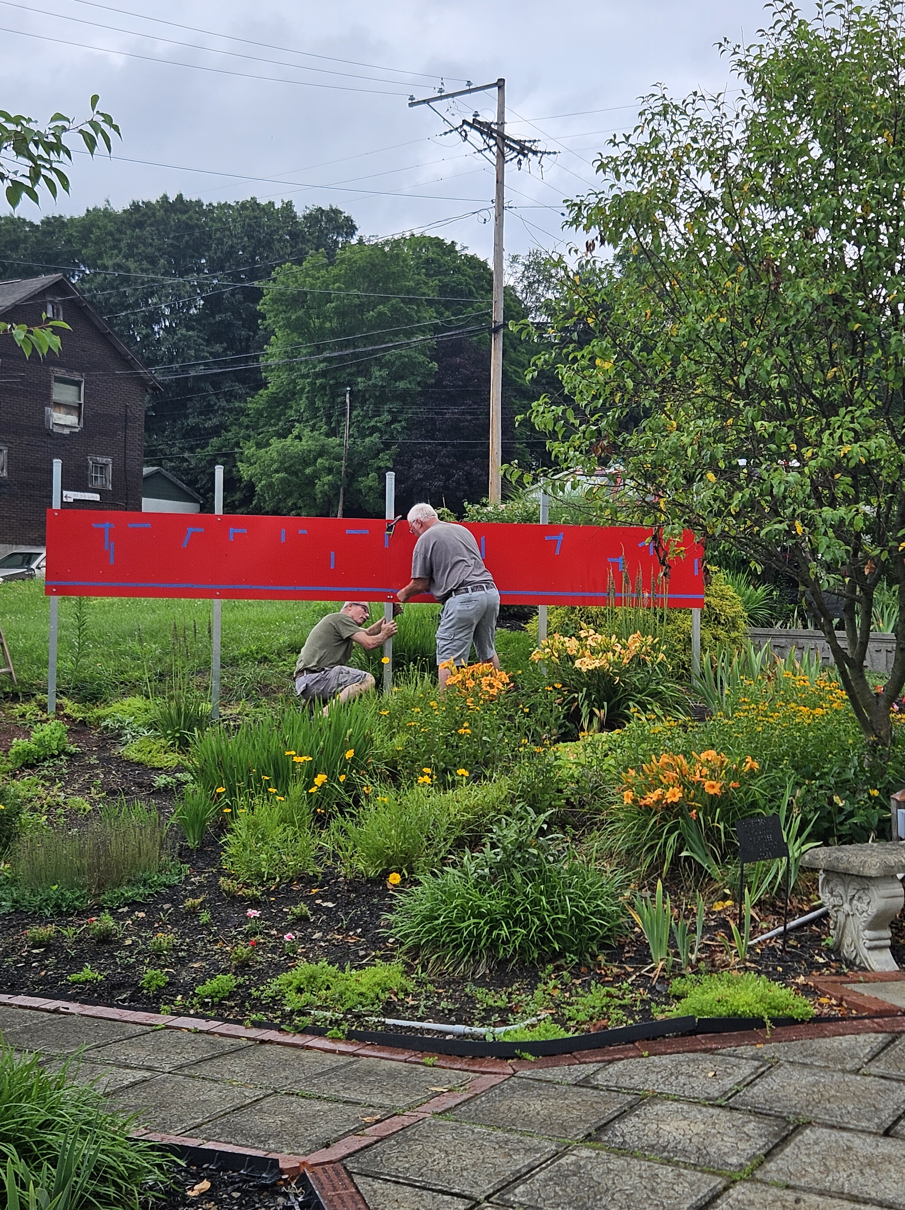 After brunch, I crossed the street to the community garden, and I saw Marsha and Pam standing under an umbrella, watching their husbands (Mike & Larry) working on hanging up a sign. The rain slowed to a sprinkle, and I realized I had never walked through the community garden. I talked with Marsha and Pam briefly and learned that they were the Co-Presidents of the Glendale Garden Club, and the club has about seven active members. They meet monthly on the 2nd Wednesday of the month, and they are always looking for members and volunteers. I walked through the entire park and was impressed by the evident love and care that has gone into this area’s upkeep. I walked through and read all of the bricks that lined the walkway. I found Shawn’s and my brother Jim’s bricks. Seeing both of their names brought tears to my eyes. My mother had ordered them to help keep their memories alive. I made a note to ask Marsha and Pam about ordering a few bricks for organizations I’m part of. They have an incredibly delightful pocket library that is full of a variety of books. I thought about how nice it is that someone could sit there and read awhile, even if they had forgotten a book. Mike and Larry were hard at work preparing the area the old 5&10 sign will be memorialized. I asked if they thought they’d finish it today, and Mike said it would be this evening. I’m excited to stop back once the project is complete!